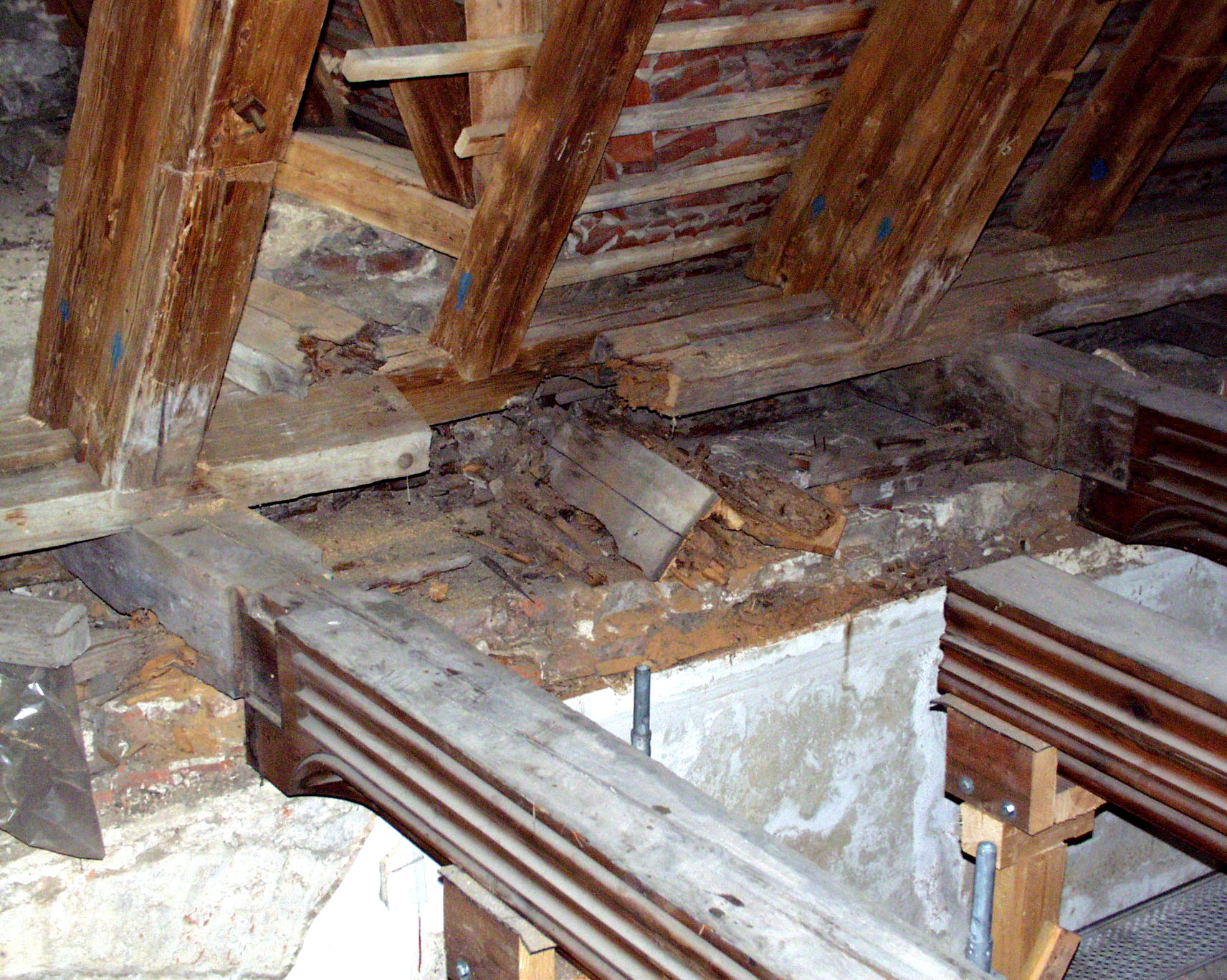 Zahlreiche Konstruktionshölzer und deren Verbindungen waren u.a. durch den Echten Hausschwamm total zerstört. Deformationsschäden und teilweises Bauteilversagen waren erkennbar. Vorhandene improvisierte Sanierungskonstruktionen, welche auf Grund von Materialengpässen zu DDR-Zeiten nur so ausführbar waren, jedoch u. a. bauphysikalische Mängel aufwiesen, wurden rückgebaut. Das Sanierungsziel bestand in der Herstellung des Dachstuhles in seiner ursprünglichen intakten Konstruktionsform, Anschuhungen und Auswechslungen wurden in der Regel mit traditionellen Zimmermannstechniken ausgeführt. Notwendige Rückschnitte wurden auf ein Mindestmaß begrenzt, was in einigen Bereichen Sonderverfahren beim Holzschutz und der Instandsetzung (z.B. BETA-Verfahren) erforderlich machte.