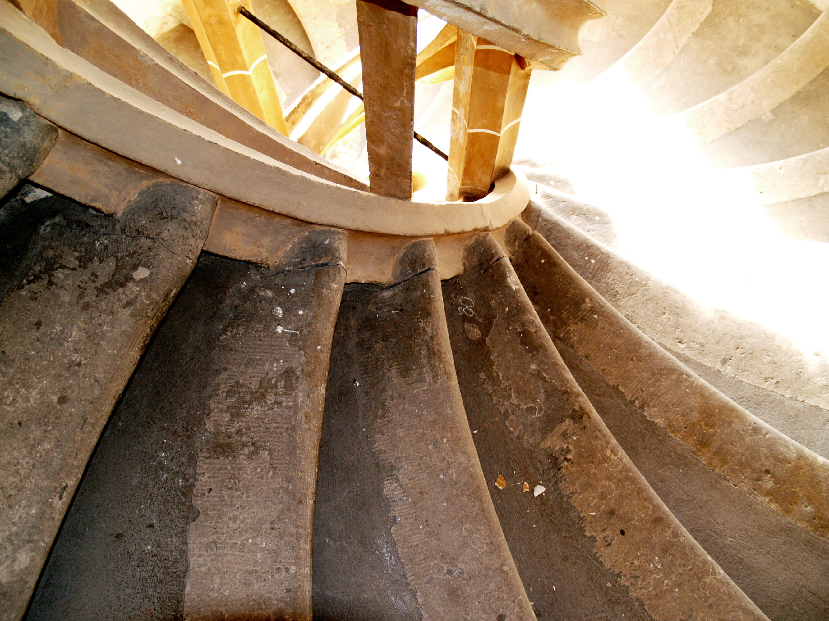 Der Baukörper des großen Wendelsteins ist nach außen hin gekennzeichnet durch die geschoßweise vor das Polygon springende Arkatur. Im Inneren windet sich der Treppenlauf mit seinen auf Zellengewölben aufliegenden Sandsteinstufen um drei gekehlte Stützen zwischen den äußeren Polygonpfeilern nach oben. Der senkrecht zum Hauptgebäude stehende Polygonpfeiler wird über dem Erdgeschoß abgefangen, da darunter der geradläufige Abgang in das 1. Kellergeschoß angeordnet ist. Den oberen Abschluss des Wendelsteins bilden ein sternförmiges Zellengewölbe und eine aufgesetzte hölzerne Turmhaube. Das abschließende sternförmige Zellengewölbe war in den inneren Drittelspunkten nahezu parallel zum Hauptbaukörper gerissen, was auf ein Abdriften des filigranen Wendelsteines vom massiven Hauptbaukörper hindeutet. Ein nach unten hin abnehmendes typisches Rissbild, wies ebenso auf einen Abriss des filigranen äußeren Wendelsteinmauerwerks vom Hauptbaukörper hin. Diese Risse verliefen von dem, sich an den Hauptbaukörper anschließenden Außenmauerwerk (Risse äußerlich und im Inneren erkennbar), parallel zu den Stufen durch die Zellengewölbe, durch den steigenden Handlauf bis zum bzw. durch das, sich an den Hauptbaukörper anschließende gegenüberliegende Mauerwerk. Weitere Risse mit weitestgehend senkrechtem Verlauf waren im Bereich der hofseitigen Brüstungen und darüber liegenden Fensterbögen erkennbar. Die Rissweiten waren ebenso nach oben hin zunehmend. Die drei im Treppenauge stehenden schlanken gekehlten und mit einer Farbfassung versehenen Sandsteinstützen, welche sich durch schmiedeeiserne Vierkantstäbe gegenseitig stabilisieren, wiesen augenscheinlich keine Schädigungen auf, obwohl diese nicht genau lotrecht übereinanderstehen. Durch den großen Rücksprung des äußeren Polygonpfeilers über EG, treten im stark beanspruchten Pfeilermauerwerk auf Grund großer Ausmitten Spannungen auf, welche über den zulässigen Spannungen der DIN 1053-1 liegen, so dass der Nachweis der Standsicherheit nur unter zu Hilfenahme von in Versuchen ermittelten Bruchsicherheiten geführt werden konnte. Durch die nun mit geringer Vorspannung ausgeführte Anbindung des Großen Wendelsteins an den Hauptbaukörper in der Dachebene, wurde das Sicherheitsniveau um 70% erhöht und die Rissbildung eingeschränkt. Mit einer Langzeitmessung werden die Horizontalbewegungen des Großen Wendelsteins überwacht, ggf. können weitere Anbindungen in den Obergeschossen nachträglich erfolgen.