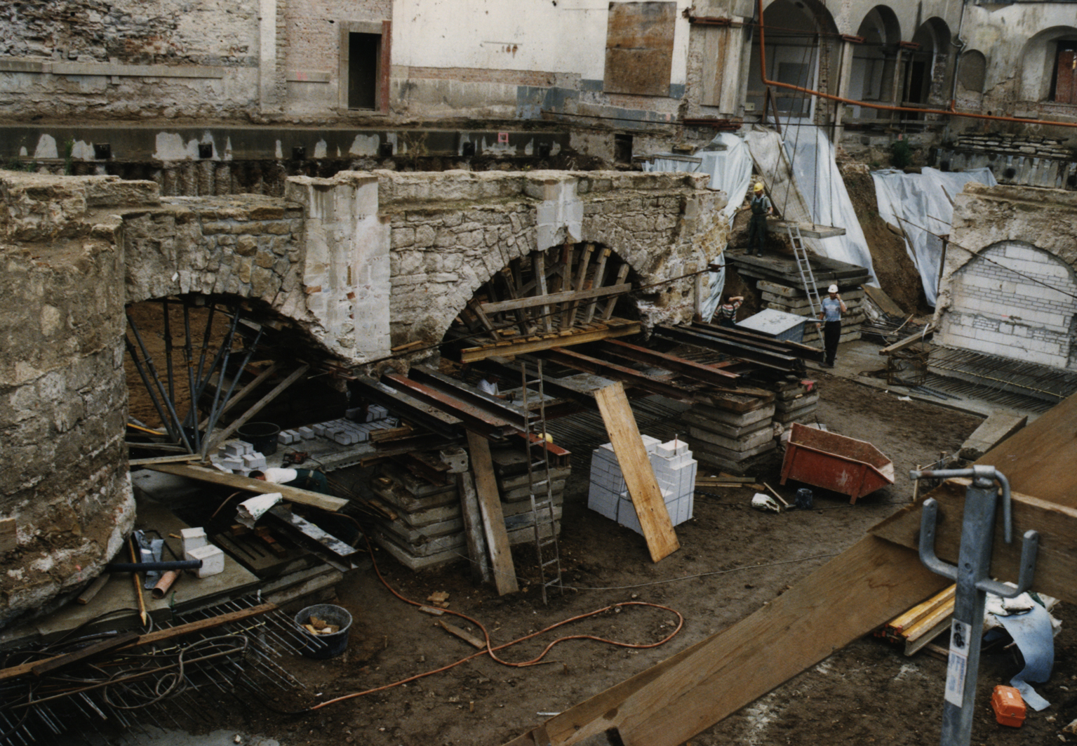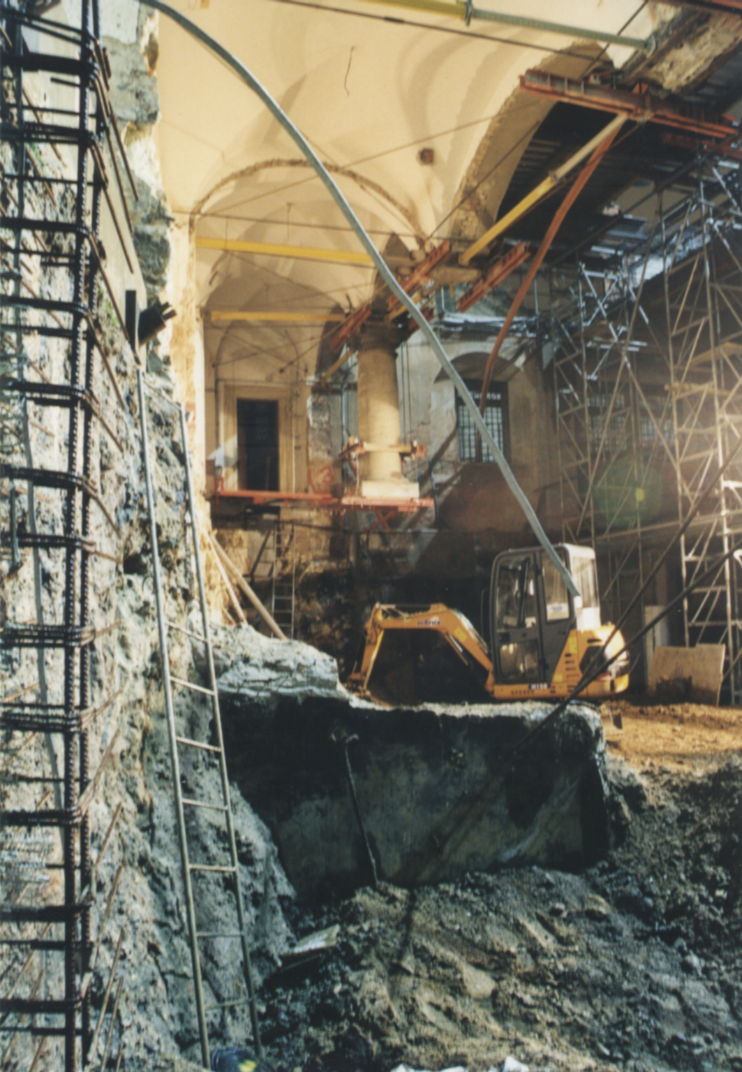 – Integration historischer Elemente wie Gründungen, Keller- und Außenwände, Gewölbe in ihrem vorgefundenen Zustand nach eingehender Material- und Zustandsanalyse in eine fugenlose, im Keller wasserdichte Gesamtkonstruktion verbunden mit Verträglichkeits- und Verformungsbetrachtungen und -berechnungen mit Entwicklung von Sonderkonstruktionen