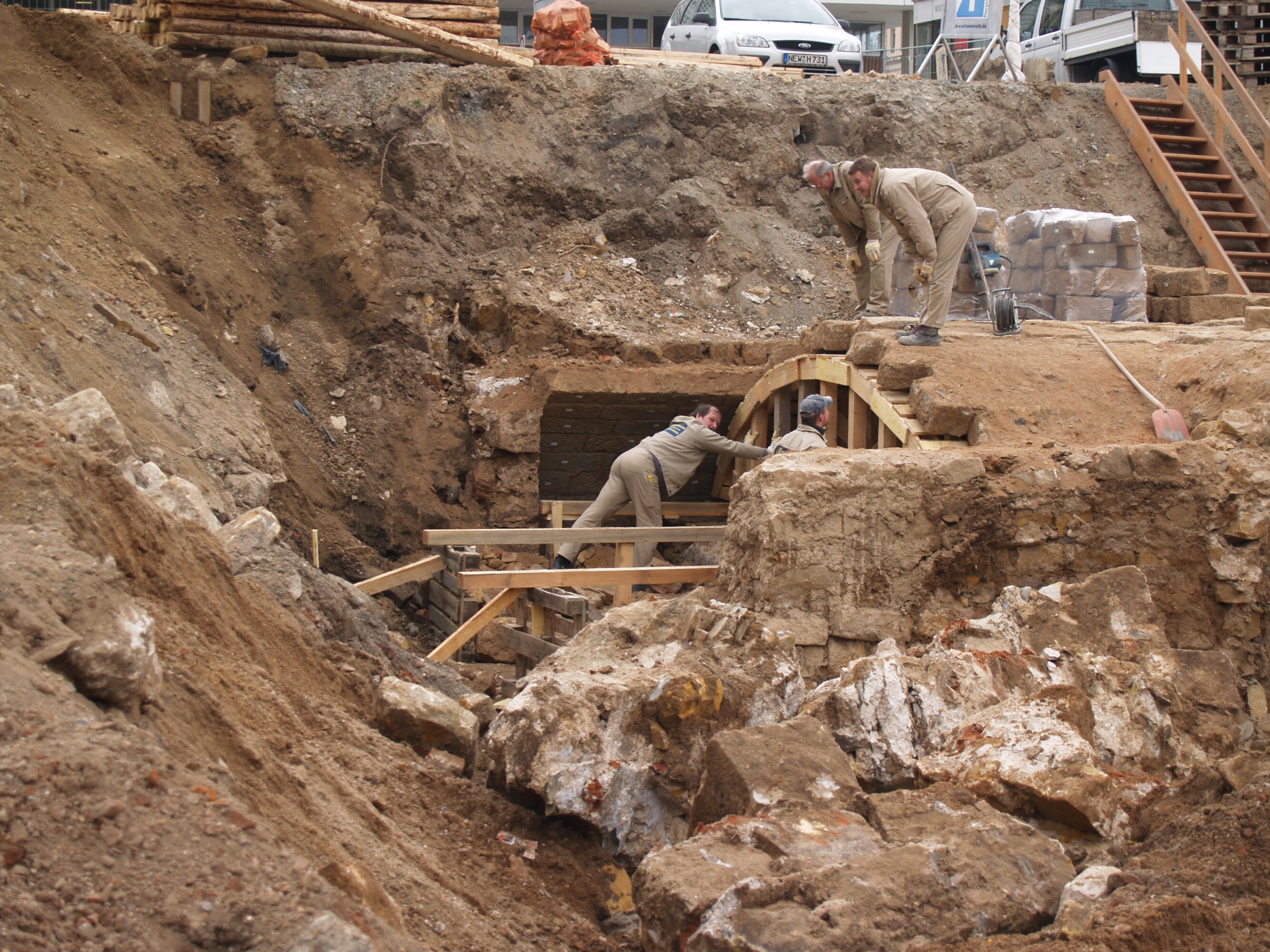 – Sicherung historischer Kellerbereiche, der Stadtmauer und Integration dieser in das wiedererstehende Gebäude