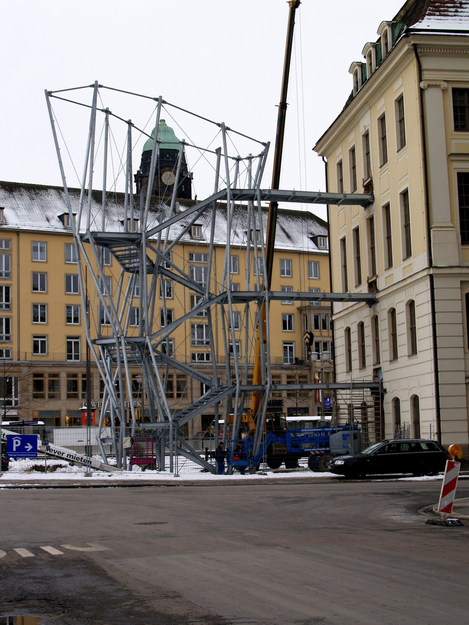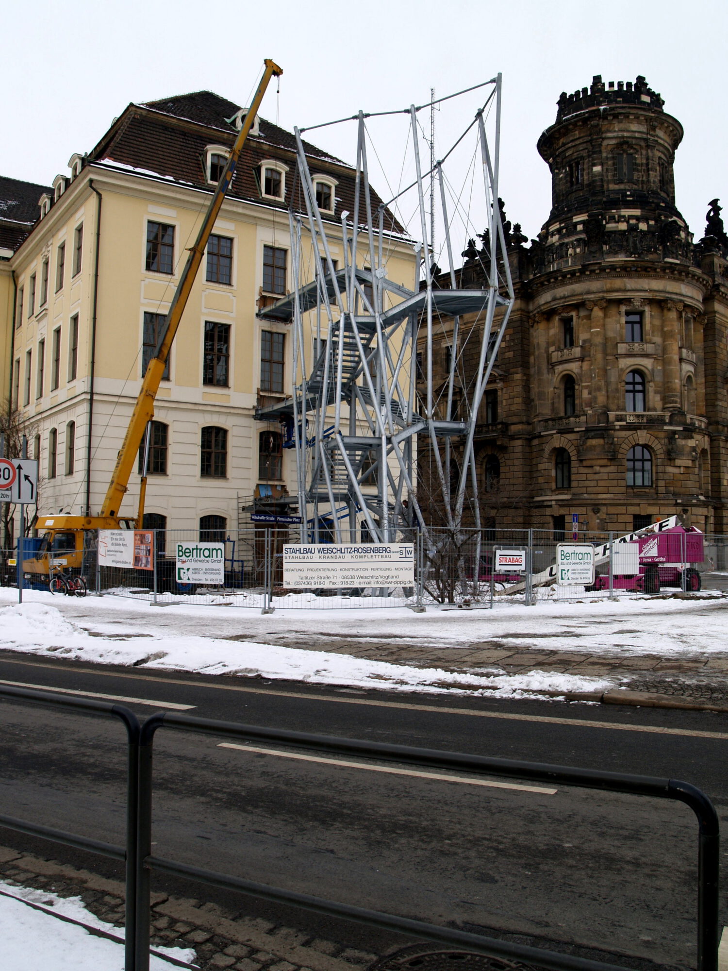 Der Neubau einer skulpturalen Fluchttreppe erfolgte an exponierter Stelle im Außenraum. In den Grenzen der gewollten architektonischen Formensprache wurde das komplexe Tragsystem optimiert.